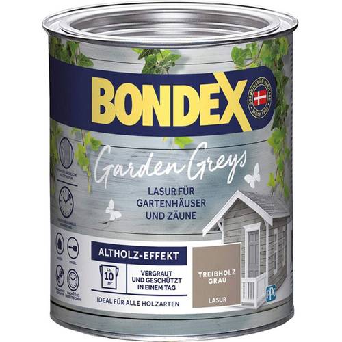 Hier sehen wir Bondex-Holzlasur „grau“, die nach wie vor in Dänemark produziert wird, wenngleich das Unternehmen inzwischen zum amerikanischen Konzern PPG Industries gehört.