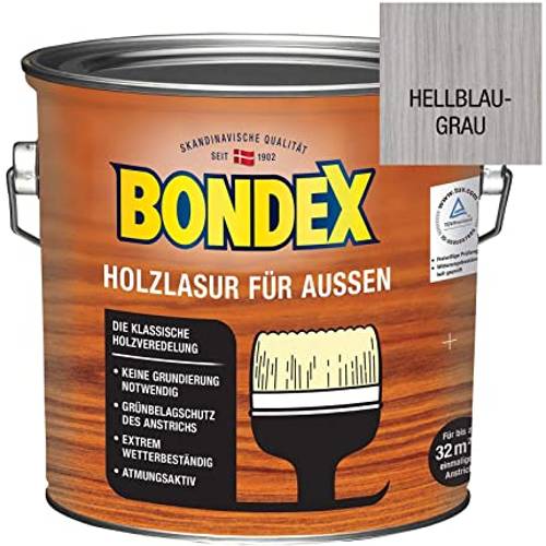 Der Hersteller nimmt für diese Bondex-Holzlasur „grau“ in Anspruch, dass sie extrem wetterfest ist.