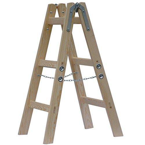 Die Holzleiter verfügt über zwei Scharniere an der Oberseite und zwei Brückenverbindungen in Mitte, sodass die Leiter nach dem Aufspannen und Betreten nicht aus ihrer Position ausbrechen kann. Einige Produkte im Vergleich müssen frei positioniert werden, sodass eine zusätzliche Person die Leiter für eine höhere Sicherheit halten sollte.