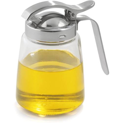 Der Honigspender aus Glas und Edelstahl kann genauso wie die Modelle aus Kunststoff einfach mit einer Hand bedient werden. Dafür verfügt das Kopfteil über einen Griff und einem darüber liegenden Dosier-Hebel. Wenn Sie diesen Hebel mit dem Daumen drücken, öffnet sich das Ausguss-Ventil. Lösen Sie den Daumendruck, schließt sich die Öffnungslasche wieder. Auf diese Weise lässt sich die Dosierung genau kontrollieren.