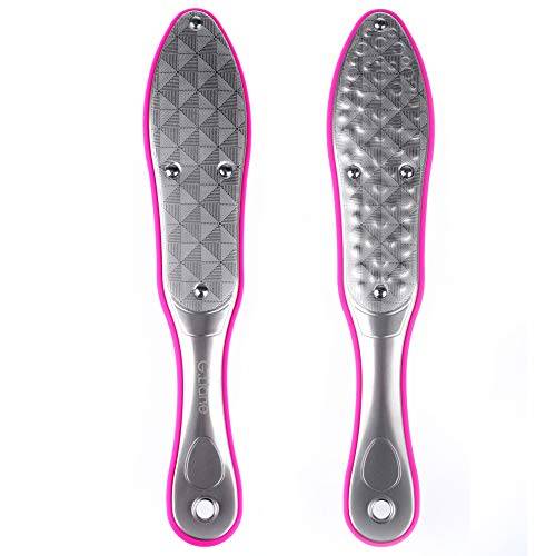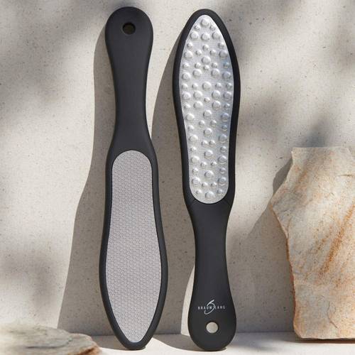 Die meisten Hornhautraspeln sind zweiseitig nutzbar. So entfernen Sie mit der rauen Oberfläche zuerst die verdickte Hornhaut und pflegen und glätten die Haut anschließend mit der feiner gekörnten Seite.
