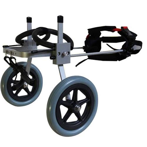 Eines der gängigen Hunderollstuhl-Modelle: Die Hinterbeine werden gestützt, da der Hund mit den Vorderbeinen noch ausreichend Kraft zum Laufen hat.
