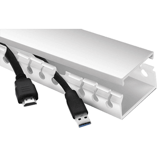 Kabelkanal: Ein Kabelkanal umschließt die Kabel vollständig, lässt sich aber auch meistens komfortabel per Klickverschluss der Länge nach öffnen, damit Sie die Kabel hineinlegen können. Achten Sie jedoch darauf, dass der Verschluss fest zu ist, sonst kann es passieren, dass sich die Kabel wieder ihren Weg nach draußen bahnen.