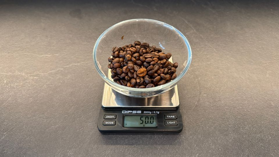 Für den praktischen Kaffeewaagen-Test messen wir zunächst 50 Gramm Kaffeebohnen mit unserer eigenen Waage ab. Wir stellen eine leere Glasschale auf die Bagail-Waage, nutzen die Tara-Funktion und füllen anschließend die Bohnen ein. Die Anzeige reagiert sofort, springt jedoch kurz zwischen verschiedenen Werten. Final stabilisiert sie sich bei 50,2 Gramm.
