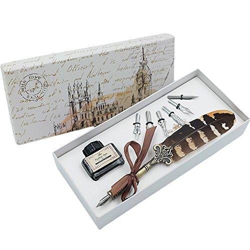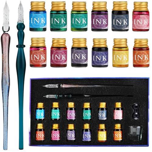 Für Fortgeschrittene bietet sich Kalligraphie-Feder-Sets zum Beispiel von Belle Vous, Ideapool oder Crelando an. Bei ihnen handelt es sich um Federhalter aus Glas oder Holz sowie meist austauschbaren Federn. Dazu gehören auch Glasfläschchen mit flüssiger Tinte und einige Kalligraphie-Set-Testsieger bieten sogar unterschiedliche Farben an.