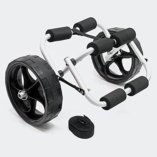 Der Decathlon-Kanuwagen, den wir hier sehen ist für Kajak, Stand Up Paddle, Windsurf- oder Surfboard gleichermaßen geeignet.