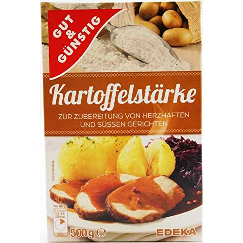 Im Bild sehen wir hier gleich zweimal die Gut-&-Günstig-Kartoffelstärke, bei der es sich um ein Produkt der gleichnamigen Edeka-Eigenmarke handelt.