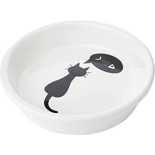 Dieser weiße Katzennapf ist besonders tief. Dies ermöglicht uns eine große Menge Futter darin zu platzieren.