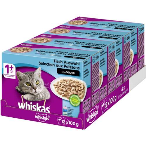 Diese Katzennassfutterpackung beinhaltet vier verschiedene Futter unterschiedlicher Geschmacksrichtungen in einzelnen Tüten.