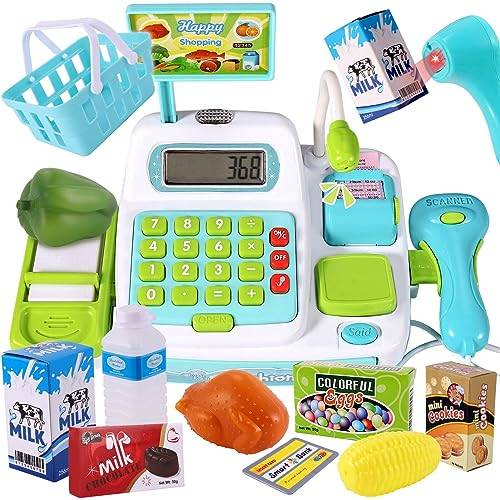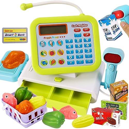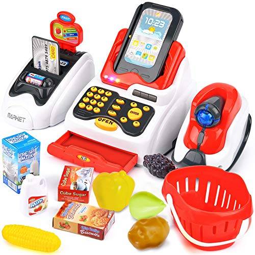 also meiner Enkelin habe ich zu ihrem 2. Geburtstag eine elektrische Kaufladenkasse aus Kunststoff gekauft. Sie hat anfänglich vor allem auf den Tasten herumgedrückt und große Freude an den Mini-Lebensmitteln gezeigt. Als sie aber älter wurde und die Zahlen besser kannte, hat sie sich intensiv mit den Preisen, das Zusammenzählen der Summen und auch mit anderen Funktionen wie dem Scanner beschäftigt.