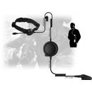 Das Kehlkopfmikrofon hat ein elastisches, verstellbares Trageband, das mittels eines Magnetverschlusses fixiert wird. Ein transparenter Schallschlauch-Ohrhörer sorgt für die Übertragung des Empfangssignals zum Ohr. Für den Ohrhörer werden verschiedene Passformteile mitgeliefert.