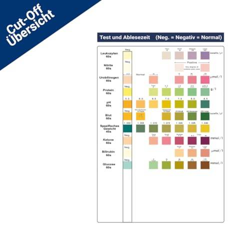 10 Indikatoren sind messbar: Leukozyten, Nitrite, Urobilinogen, Protein, pH-Wert, Blut, spezifisches Gewicht, Ketone, Bilirubin und Glucose