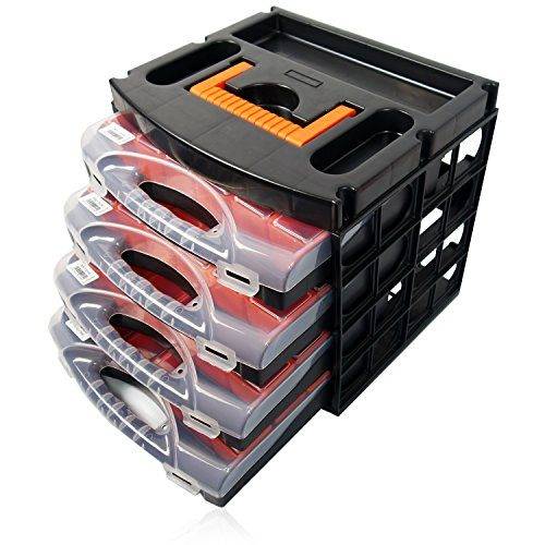 Lagern Sie Ihr Werkzeug und das Zubehör in einem Schrank, reparieren und bauen aber vornehmlich an anderer Stelle in Ihrer Wohnung oder bei Freunden und Bekannten, kann ein Sortierkasten zum Mitnehmen praktisch sein. In verschiedenen Tests zu Kleinteilemagazinen im Internet finden sich solche Kästen mit verschließbaren Fächern. Sie bestehen zumeist aus mehreren Boxen, die im Vergleich zu feststehenden Magazinen insbesondere den Nachteil haben, dass Sie den Inhalt der Fächer nicht sofort einsehen können. Dafür haben Sie Ihre sämtlichen Eisenwaren stets für den schnellen Transport zur Hand.