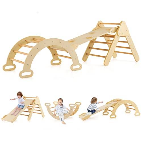 Wir sind von den vielfältigen Eigenschaften des Costway-Kletterdreiecks beeindruckt. Dieses 4-in-1 Klettergerüst bietet eine Kombination aus Kletterdreieck, Kletterbogen und einer doppelseitigen Rutsche, die auch als Rampe genutzt werden kann. Die Möglichkeit, diese Elemente sowohl zusammen als auch separat zu nutzen, schafft endlose Unterhaltungsmöglichkeiten und fördert die motorischen Fähigkeiten und die Kreativität der Kinder. Hergestellt aus natürlichem Buchenholz und mit glatt polierten Kanten bietet das Set zudem eine sichere und langlebige Spielumgebung. Die solide Konstruktion garantiert Stabilität und Sicherheit beim Spielen. Alles in allem ist dieses Klettergerüst, dass sich nicht nur in stundenlangem Spielspaß, sondern auch in der Entwicklung wichtiger Fähigkeiten auszahlt, eine empfehlenswerte Wahl für Eltern, die ihren Kindern ab 1 Jahr eine freudige und entwicklungsfördernde Spielzeit ermöglichen möchten.