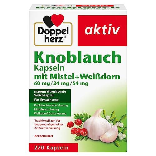 Die Doppelherz-Knoblauch-Kapseln setzen zudem auf Mistel und Weißdorn, wie wir hier sehen, um einer Arterienverkalkung vorzubeugen.