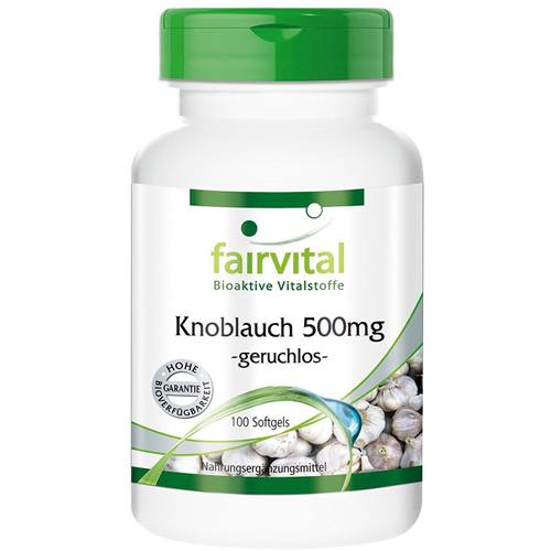 Platz 2 | Fairvital Knoblauch 500mg | ca. 9 € | 2 Kapseln pro Tag ca. 0,20 € | weißer Knoblauch | ![]() ![]() | |