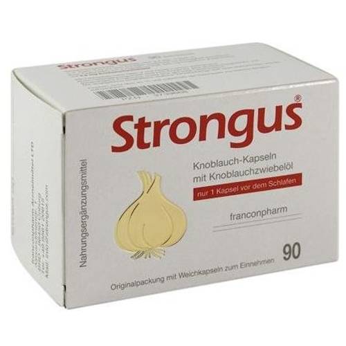 Platz 4 | franconpharm Strongus Knoblauch-Kapseln | ca. 16 € | 1 Kapsel pro Tag ca. 0,19 € | weißer Knoblauch | ![]() ![]() | |