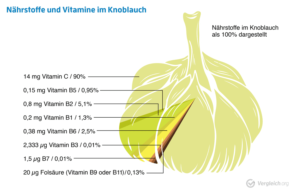 » Mehr InformationenKnoblauch ist gesund und eine natürliche Quelle für Nährstoffe und Vitamine; 100 g Knoblauch enthalten: