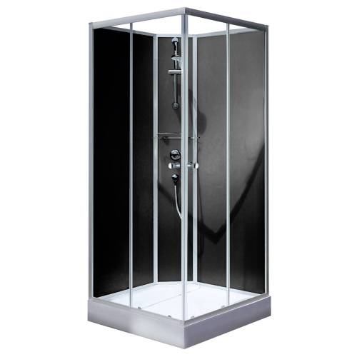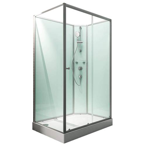 Auf diesem Bild sehen wir eine Schulte-Komplettdusche, die drei Seiten aus Glas aufweist – nur die Rückwand ist unduchsichtig.