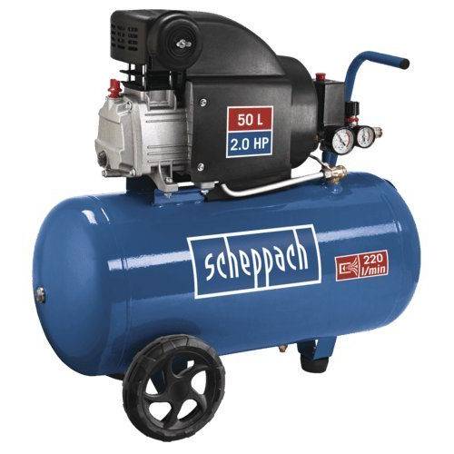 Hier sehen wir einen Scheppach-Kompressor 50l-HC52dc, der bis zu 8 bar Druck liefert.