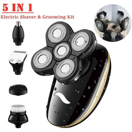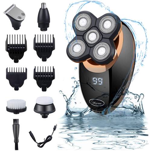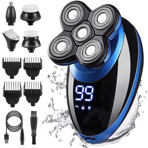 Auf diesem Bild sehen wir einen Kasakily-Kopfrasierer für 0,0 mm, zu dem verschiedene Aufsätze, wie z. B. ein Nasenrasierer, eine Gesichtsreinigungsbürste oder eine Massagebürste.