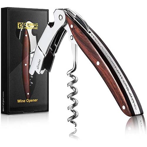 Kellnermesser![]() | Zumeist verfügt ein Korkenzieher Kellnermesser über ein kleines Messer zum Abtrennen der Kapsel am Flaschenhals. Seitlich am Griff des vom Messer gibt es einen Hebel zum Herunterdrücken auf den Flaschenhals. Der Korken kann mit einer Hebelbewegung aus der Flasche gezogen werden. Manche Messer verfügen auch über einen Doppelhebel. Besonders praktisch ist dieser Öffner für lange Korken, da so ein Abrutschen von der Flasche verhindert wird. |