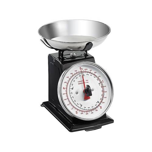 Bei dieser Küchenwaage kommt eine Federmechanik zum Einsatz, um das Gewicht zu ermitteln. Ein Ziffernblatt mit Skala zeigt das Gewicht an.