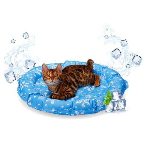 Katzen-Kühlmatten mit Gel kommen gänzlich ohne Strom oder Wasser aus, Sie müssen also nichts weiter unternehmen, als diese auszubreiten. Die Kühlung des Gels wird per Druck aktiviert: Sobald Ihre Katze sich darauf legt, kühlt die Matte. Die besten Kühlmatten für Katzen kühlen auf 7 bis 9 Grad unter Umgebungstemperatur. Dabei können Sie ganz unbesorgt sein: Ihre Katze kann sich nicht verkühlen, dafür reicht die Kühlleistung nicht aus.