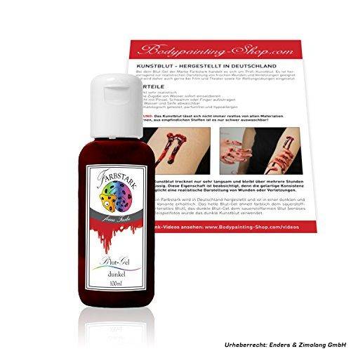 Gelartiges Kunstblut ist dickflüssiger und eignet sich als Kunstblut für tiefe Wunden, geronnenes Blut oder Blutklumpen. Es bleibt an Ort und Stelle und verläuft nicht. Laut Online-Tests von Kunstblut ist das Auftragen dickflüssigen Kunstblutes besonders einfach.