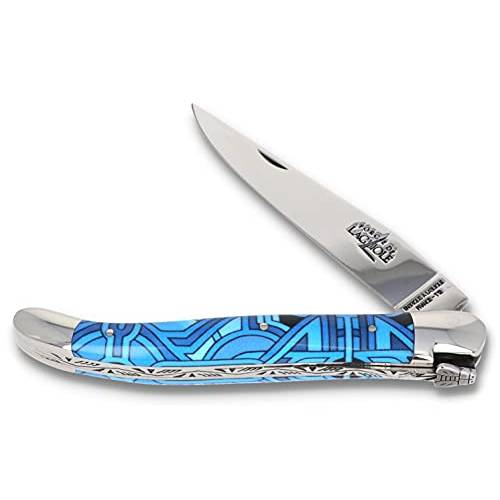 Einige Laguiole-Messer bestehen aus Damast-Stahl. Diese mehrschichtige Legierung weist ein detailliertes Muster auf. Wegen des enormen Arbeitsaufwands kosten Messer mit Damastklingen ein Vielfaches.