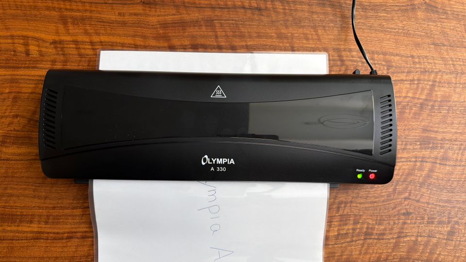 Das Laminiergerät Olympia A 330 arbeitet mit Folienstärken zwischen 80 und 125 µm. Die maximale Größe liegt bei A3, mit einer Geschwindigkeit von 300 Millimetern pro Minute. Das Gerät unterstützt Heiß- und Kaltlaminieren. Mitgeliefert werden 15 Folien in verschiedenen Formaten. Im Test zeigt Olympia eine solide Bedienbarkeit. Es kommt aber zu leichten Wellen auf der Folie.