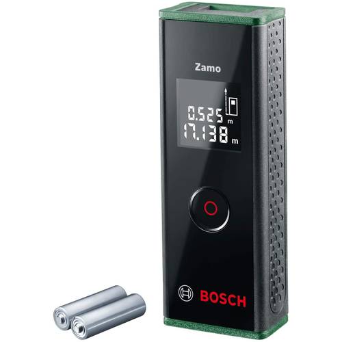 Auf diesem Bild sehen wir den Bosch-Laser-Entfernungsmesser „Zamo“, der Abstände bis zu 20 m misst und per Doppelklick auch Flächen berechnet.