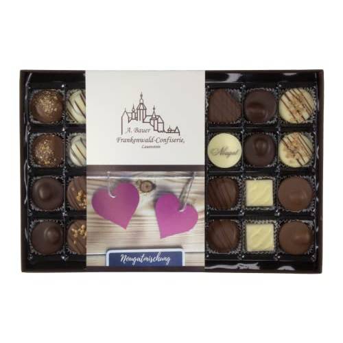 Greifen Sie alternativ zu einer reinen Nougatmischung. Neben Amarena-Nougat erwarten Sie klassische Pralinen auf Basis von Haselnuss-, Walnuss- und Kokos-Nougat. Karamell- und Krokantvariationen sorgen für noch mehr Abwechslung.