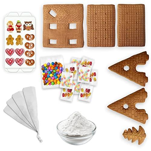 Das Weiss-Lebkuchenhaus, das wir hier sehen, enthält 900 g fertig gebackene Lebkuchenteile, Zuckerguss und bunte Dekoelemente zum Selbstbauen.