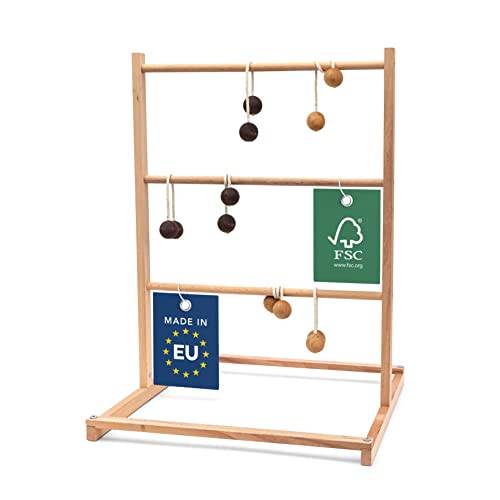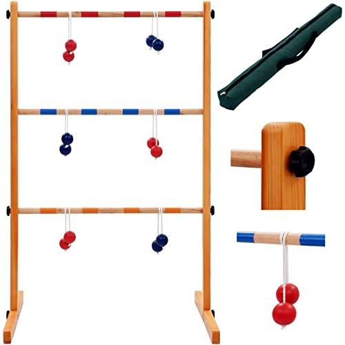 Die Leitergolf-Regeln sind ganz einfach: Sie werfen eine Bola (das sind zwei mit einer Schnur verbundene Kugeln) auf das Ladder-Golf-Gestell. Ziel ist es, dass die Bola auf einer Quersprosse hängen bleibt. Je nach Landung und Konstellation werden Punkte vergeben. Diverse Leitergolf Tests haben gezeigt, dass Sie das Spiel sowohl draußen als auch im Haus oder in der Wohnung spielen können – je stabiler das Gestell, desto besser funktioniert das Leitergolf-Spiel unter freiem Himmel.