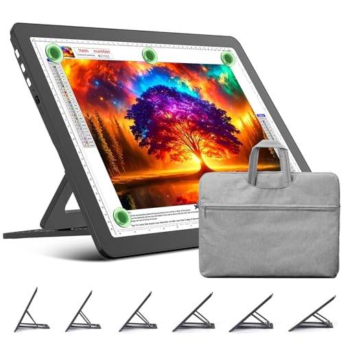 Der Iodoo Leuchttisch A3 bietet mit seinem wiederaufladbaren 2500-mAh-Akku eine hohe Mobilität und Flexibilität für Künstler und Designer. Seine vielseitige Verwendbarkeit, sei es für 5D-Diamond-Painting, Skizzieren, Zeichnen oder Röntgenbetrachtung, kombiniert mit augenfreundlicher LED-Technologie und einstellbaren Lichtfarben, setzt ihn im Vergleich in eine herausragende Position. Sein geringes Gewicht und die mitgelieferte Tragetasche erhöhen zusätzlich den Komfort beim Transport.