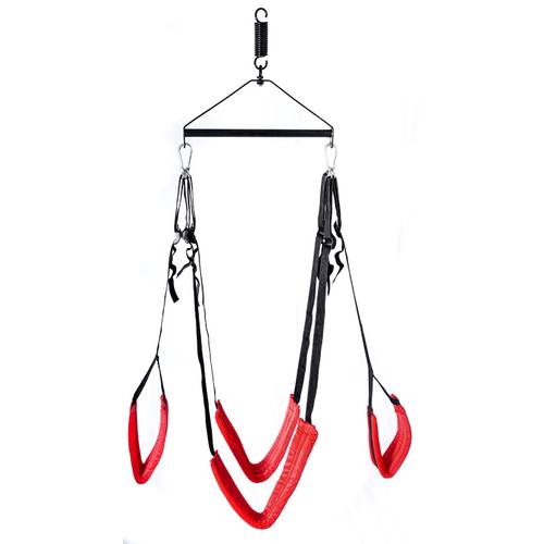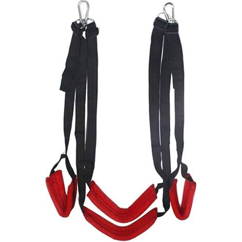 Hier sehen wir eine Yiliya-Liebesschaukel, die durch ihre roten Polster an den schwarzen Nylongurten auffällt.
