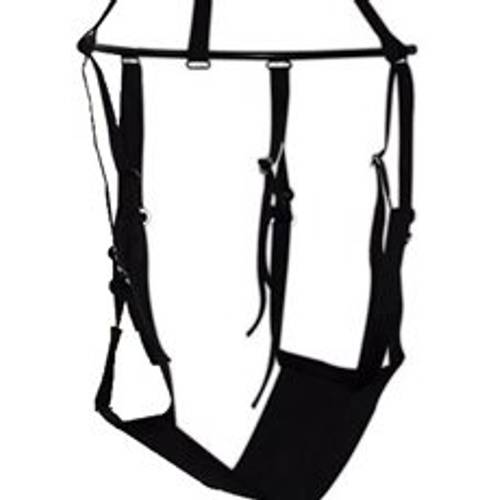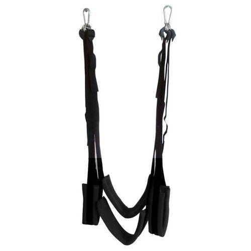 Körperschaukel | Für die Körperschaukel benötigen Sie keine Befestigung, da sie weder an einer Tür noch an der Decke angebracht wird. Stattdessen hängt sich einer der Partner – im Optimalfall der schwerere – den oberen Teil der Ausrüstung um seinen Oberkörper und trägt so die zweite involvierte Person mit seinem Eigengewicht. Letztere steigt quasi in die im Bild nach unten weisenden Schlaufen ein und versucht, darin Halt zu finden. Von allen Typen ist dieser gemäß Erfahrungen mit einer Liebesschaukel ohne Frage derjenige, der allen Beteiligten koordinativ am meisten abverlangt. |