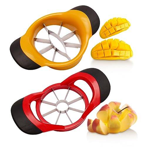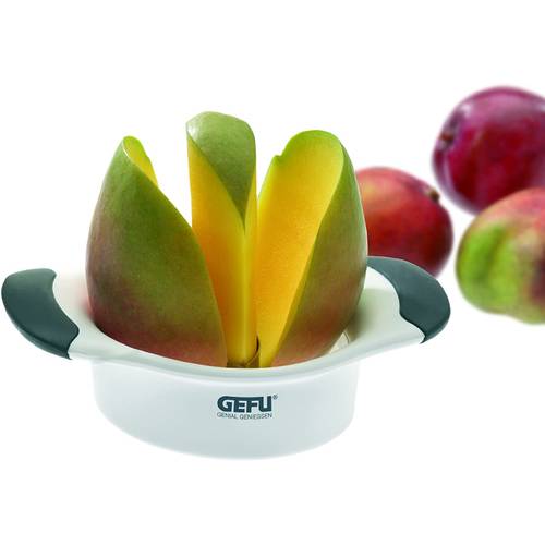 Die meisten Mangoteiler, wie beispielsweise von Gefu, entkernen die Frucht und schneiden sie dabei in zwei Hälften. Das Fruchtfleisch kann dann mit dem eingangs beschriebenen Trick in Würfel geschnitten werden.