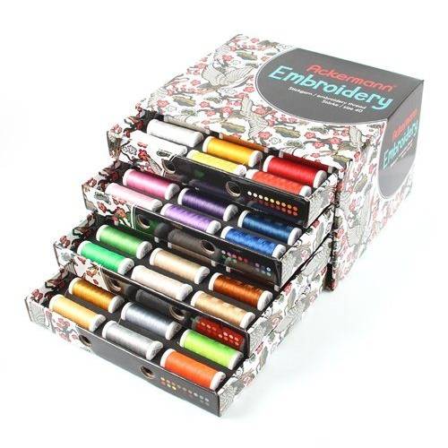 Es gibt sogar Maschinenstickgarn mit 5.000 m, was ideal für alle Farben ist, die sehr häufig verwendet werden. Zusätzlich praktisch, aber nicht notwendig, ist eine inkludierte Transportbox, in der das Garn platzsparend und übersichtlich aufbewahrt werden kann.