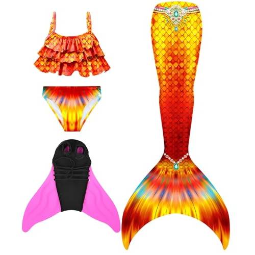 Ein Set besteht aus einer Monoflosse, die sich mit oder ohne Gurt an den Füßen fixieren lässt. | Darüber wird dann der Meerjungfrauenschwanz gestülpt, der Ihrem Kind bis zur Taille reichen wird. | Ein Bikini- oder Tankini-Oberteil oder ein kompletter Badeanzug komplettieren das Set und rüsten fürs Wasser. |