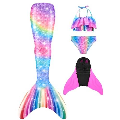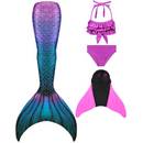| Ein Set besteht aus einer Monoflosse, die sich mit oder ohne Gurt an den Füßen fixieren lässt. | Darüber wird dann der Meerjungfrauenschwanz gestülpt, der Ihrem Kind bis zur Taille reichen wird. | Ein Bikini- oder Tankini-Oberteil oder ein kompletter Badeanzug komplettieren das Set und rüsten fürs Wasser. |