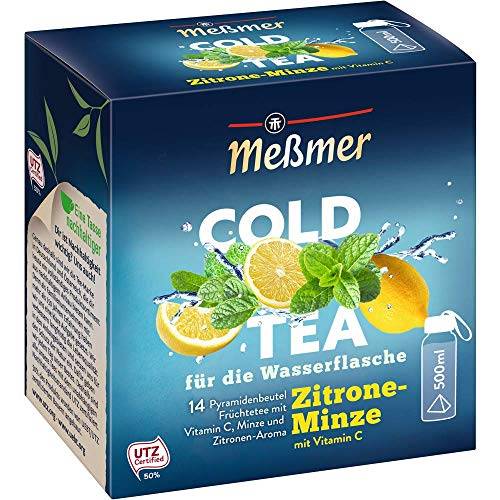 Diese Packung Meßmer-Cold-Tea „Zitrone Minze“ enthält 14 Pyramidenbeutel, die in jeweils 500 ml kaltes, stilles Wasser gegeben werden. Insgesamt ergibt die Packung 7 Liter Cold-Tea.