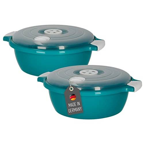 Eine Mikrowellen Schüssel (oft auch: Mikrowellen Topf) eignet sich dagegen sehr gut für den Transport. Die Schüssel gibt es tendenziell eher als Geschirr Set zu kaufen, sodass gleich mehrere Schüsseln verschiedener Größen als komplettes Mikrowellengeschirr (Deckel inkl.) zur Verfügung gestellt werden. Wie viel die Schüsseln fassen können, wird meist in Liter angegeben. In der Schüssel können Speisen jeglicher Art aufgewärmt werden, von Suppe über Pasta.