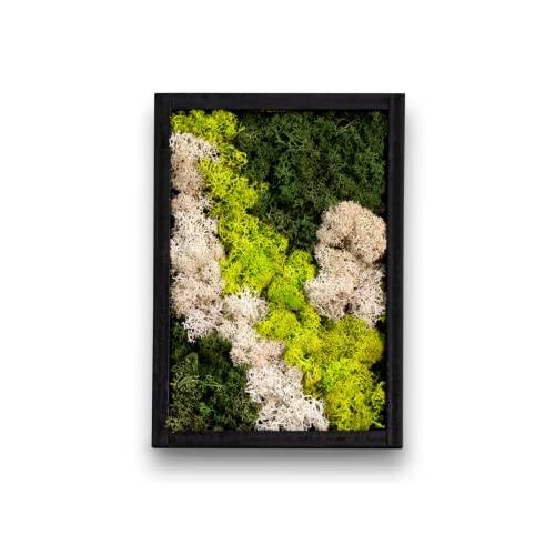 Viele Moosbild-Rahmen werden aus Holz hergestellt. Häufig können Sie aus verschiedenen Holzarten wie Birken-, Kiefern- oder Eichenholz wählen. Es gibt auch Rahmen für Moosbilder aus Altholz oder lackiertem Holz. Aufgrund der Vielfalt der Holzrahmen lassen sie sich in jeden Einrichtungsstil integrieren.