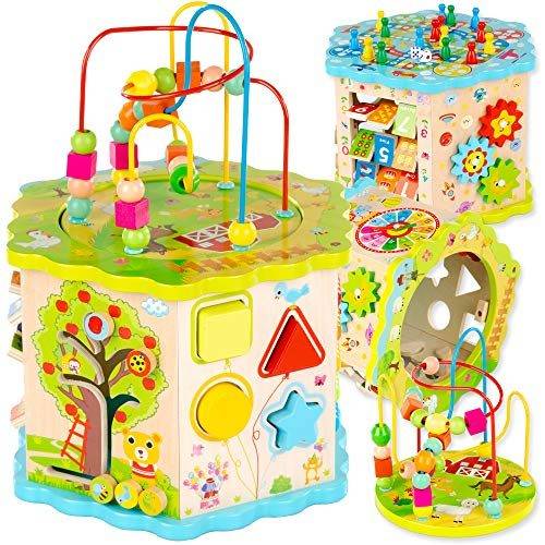 Schon ab dem 18. Lebensmonat können Sie durchaus in einen größeren und komplexeren Aktivitäten-Würfel bzw. Motorikwürfel aus Holz investieren. Diese Lernwürfel bieten eine größere Bandbreite an Spielmöglichkeiten und mehr Auswahl, um die Fein- und Grobmotorik des Kindes zu schulen. Durch verschiedene Motorikschleifen, Maltafeln, Kugel- und Zählbahnen gehen Ihrem Kind die Möglichkeiten nicht so schnell aus.