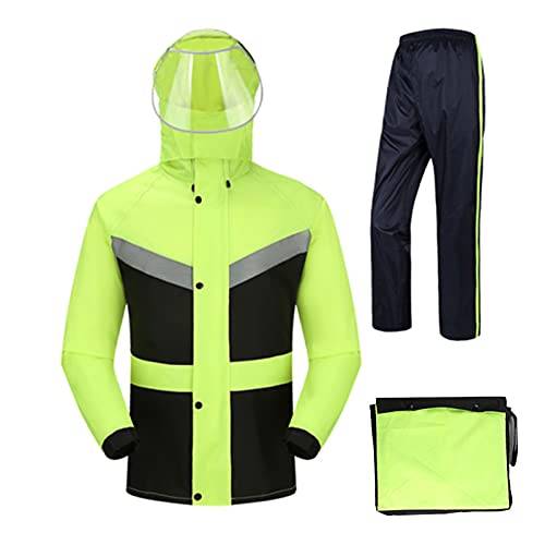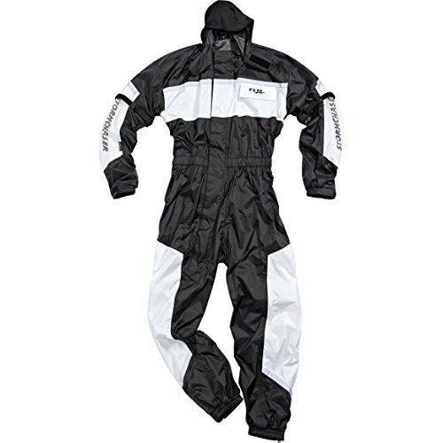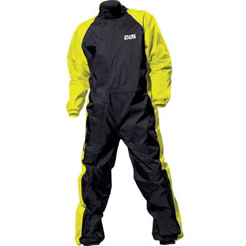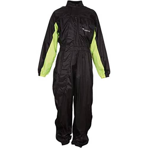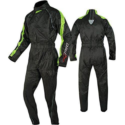 Hier sehen wir eine Probiker-Motorrad-Regenkombi, die mit der konstrastreichen Gestaltung für eine gute Sichtbarkeit sorgt.