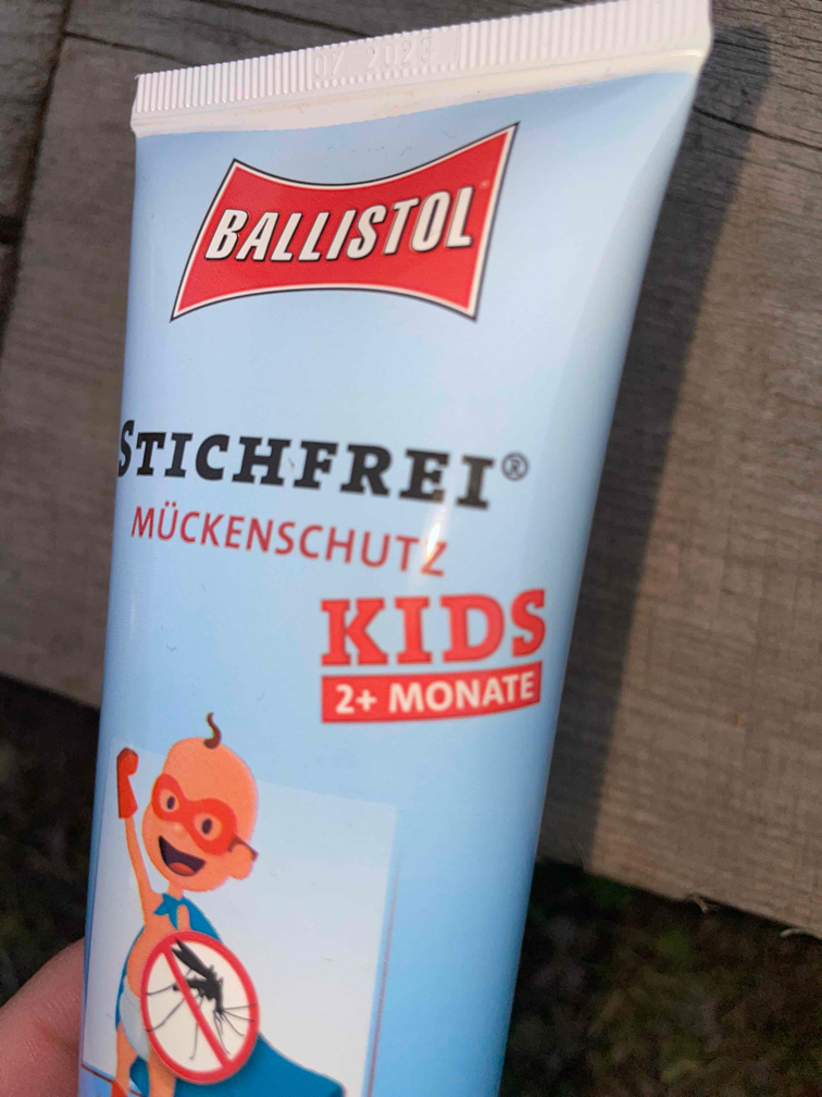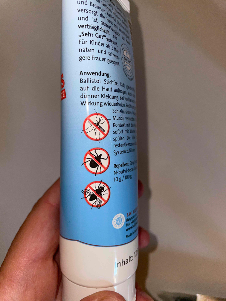 Diese Balistol-Mückenschutz-Creme soll, wie wir erfahren, nicht in die Schleimhäute gelangen.