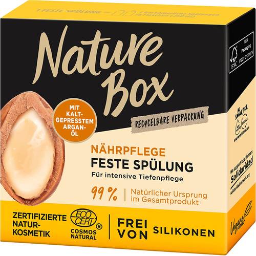 Feste Spülungen von Nature-Box sind auch sehr beliebt. Sie sind in der Regel ergiebiger und kommen ohne Plastikverpackung aus. Falls Sie von flüssiger Spülung zu fester umsteigen möchten, bietet die Marke die gleichen Sorten auch in fester Form an. Ein Beispiel ist hierbei die Nature-Box-Spülung mit Avocado oder auch die Nature-Box-Spülung Kokos. Auch erhältlich ist die Sorte Mandel von Nature-Box, die nährendes Mandelöl enthält.