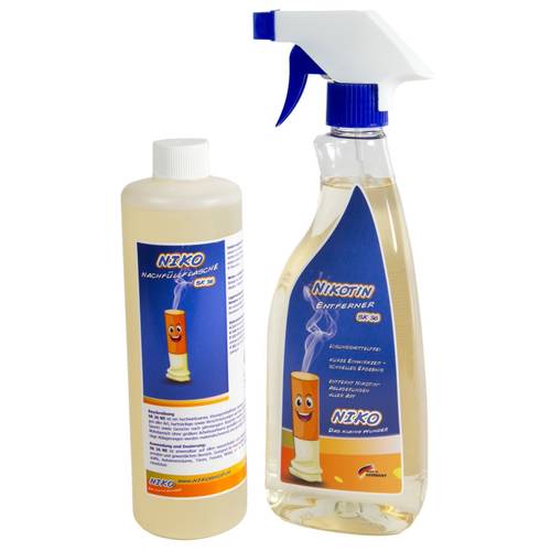 Sprühflaschen erleichtern die einfache und gezielte Anwendung von Nikotinentferner (zum Beispiel von Marken wie MELLERUD).
